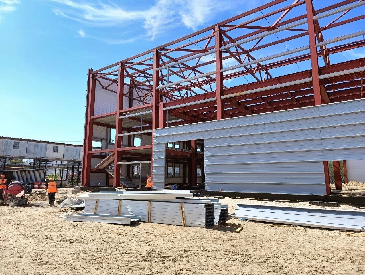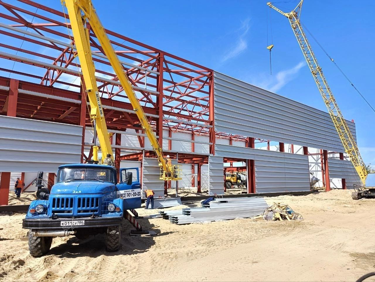 Ведутся работы по устройству ограждающих стеновых и кровельных конструкций здания. Осуществляется монтаж технологического оборудования.
