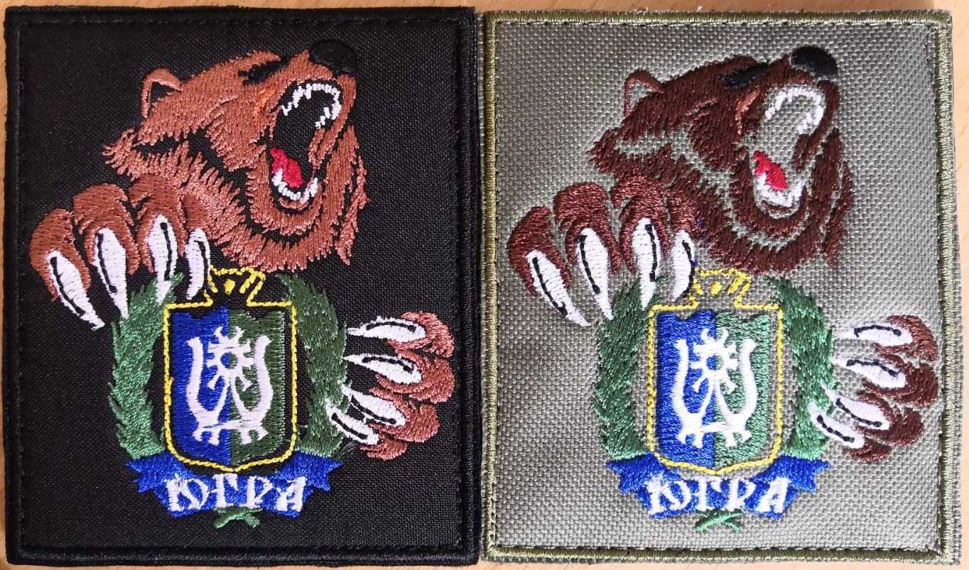 Уже прославленный в боях шеврон выглядит эффектно: на черном фоне бурый медведь грозно рычит, бережно держа когтистыми лапами герб Югры.