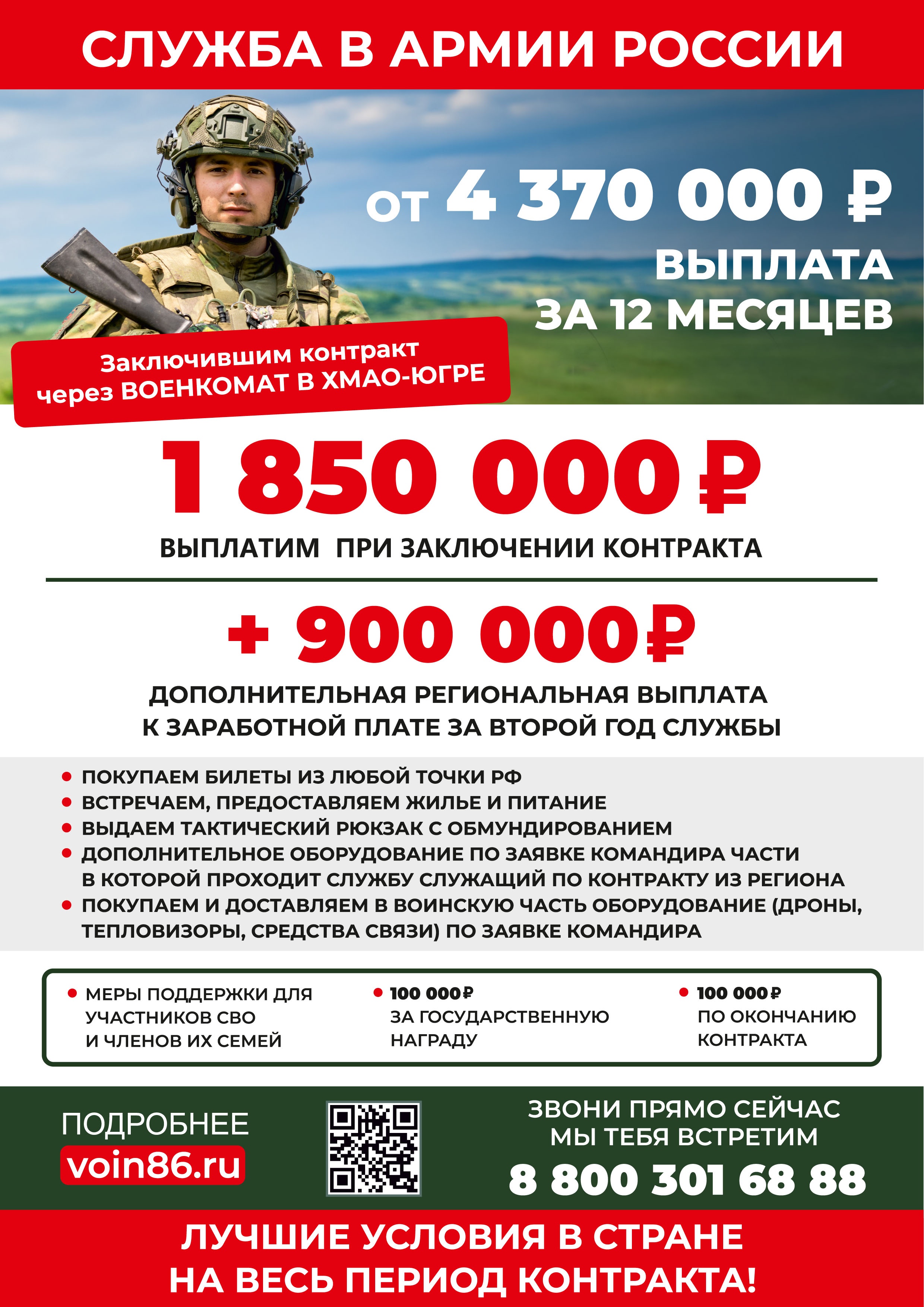 Арифметика поддержки Помимо этого, заключившим контракт в Югре полагаются регулярные выплаты при прохождении службы. Военнослужащий получает 900 тысяч дополнительно к заработной плате за второй год службы. Данная дополнительная выплата к денежному довольствию является самой высокой в России и в отличие от других регионов осуществляется весь период службы. По окончании контракта военнослужащему из Югры полагается выплата в 100 тысяч рублей. Кроме того, бойцу выплачивают 100 тысяч рублей за госнаграду.