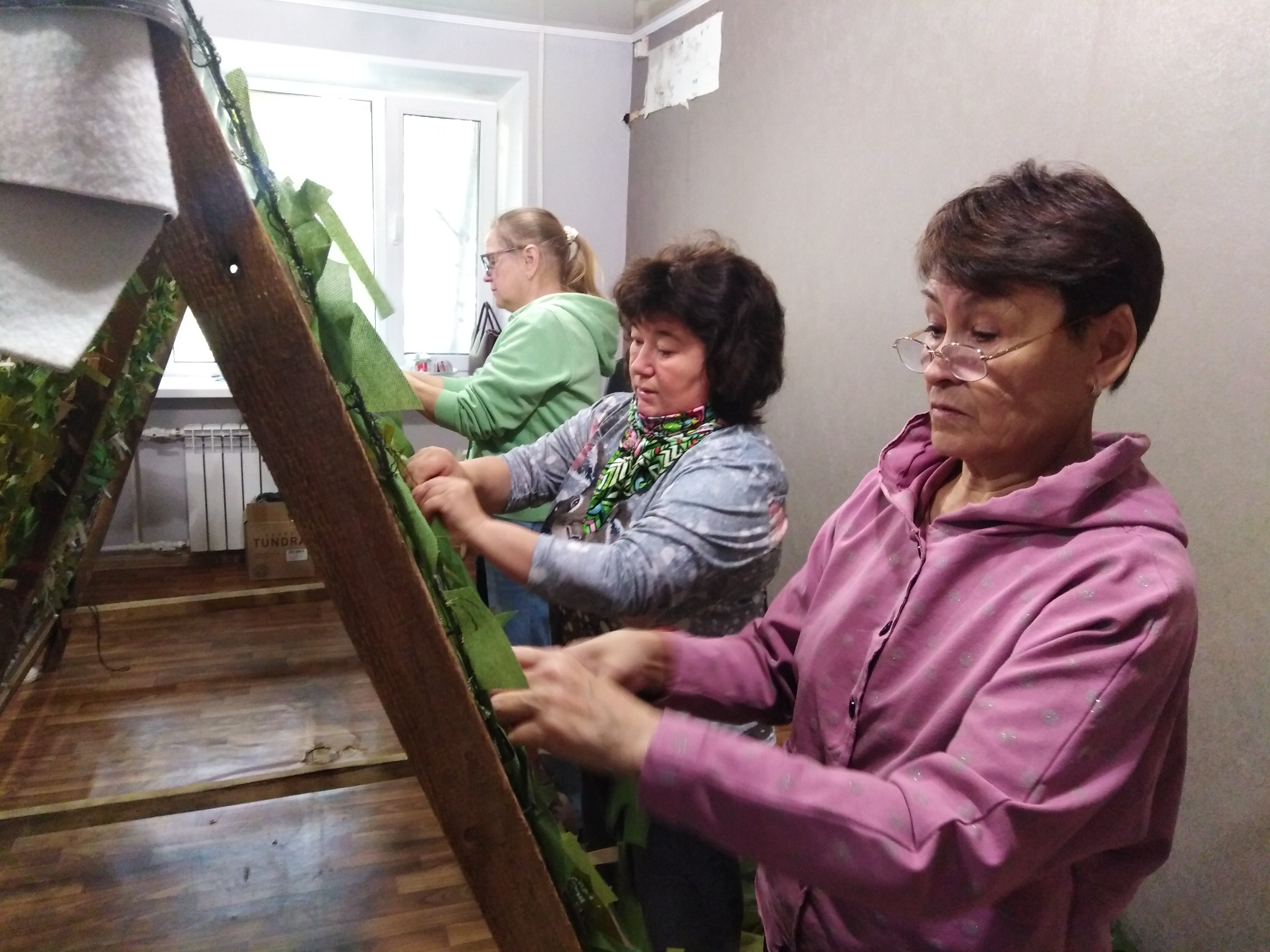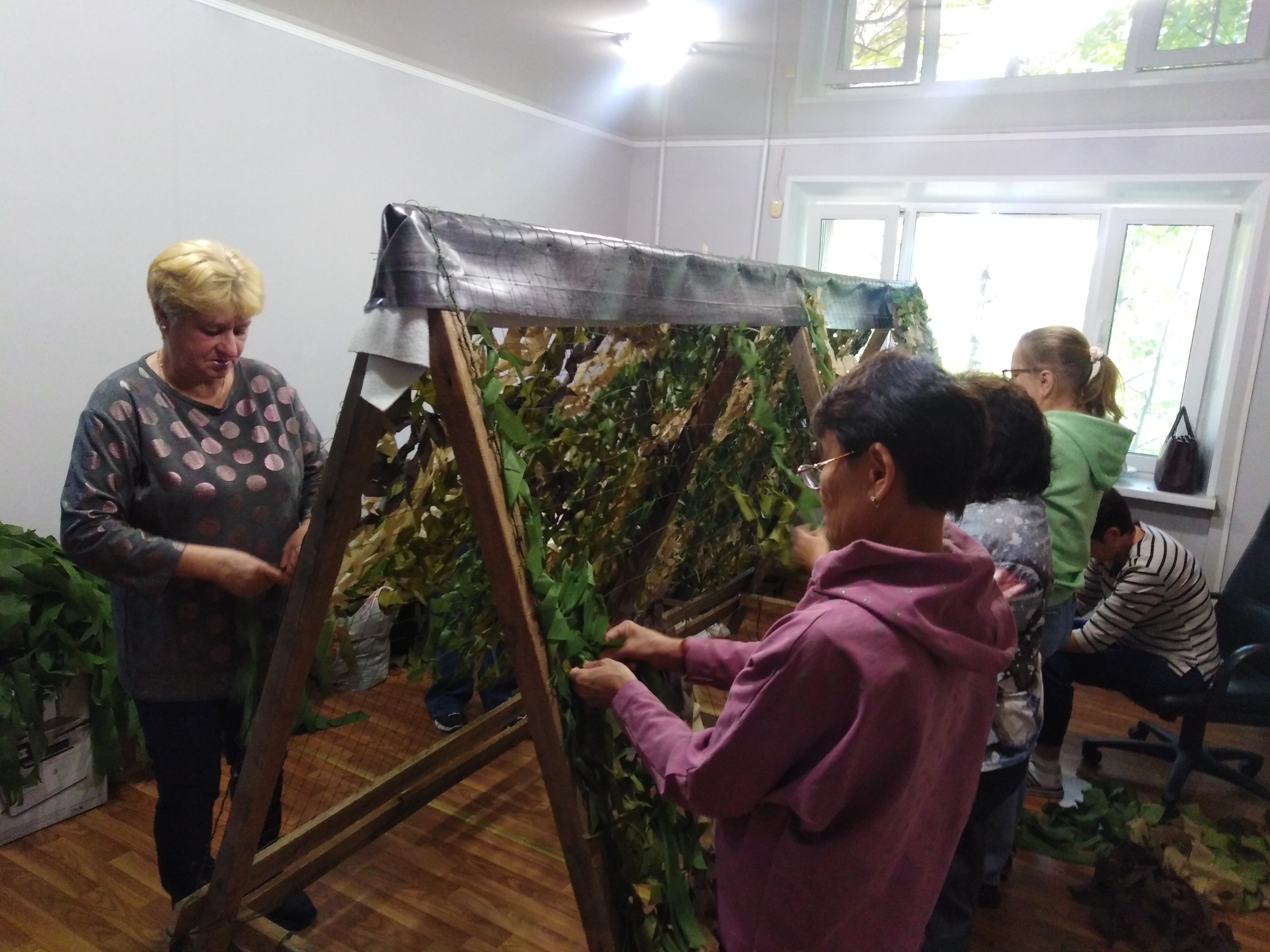 Готовая сеть имитирует цвет травы и листвы, поэтому в работе используются ленты разных оттенков. Летом – это сочная и светлая зелень, осенью – земельные, болотные, песочные цвета. Кроме этого, волонтёры изготавливают и другие принадлежности, необходимые бойцам.