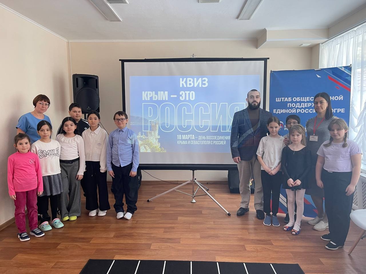 В день воссоединения Крыма и Севастополя с Россией Роберт Акулинин, активист Штаба общественной поддержки Белоярского района, член Молодежной общественной палаты, провел для ребят детского отделения Комплексного центра познавательный квиз по культуре и истории Крымского полуострова и города-героя Севастополя.Дети узнали о покорении Крыма, роли Екатерины Великой в историческом присоединении земель, как князь Потемкин получил двойную фамилию и почему Севастополь - город федерального значения. Две команды сражались за звание победителя викторины, каждый получил сладкий приз от Штаба общественной поддержки и, конечно, узнал много нового о возвращении Крыма в родную гавань.
