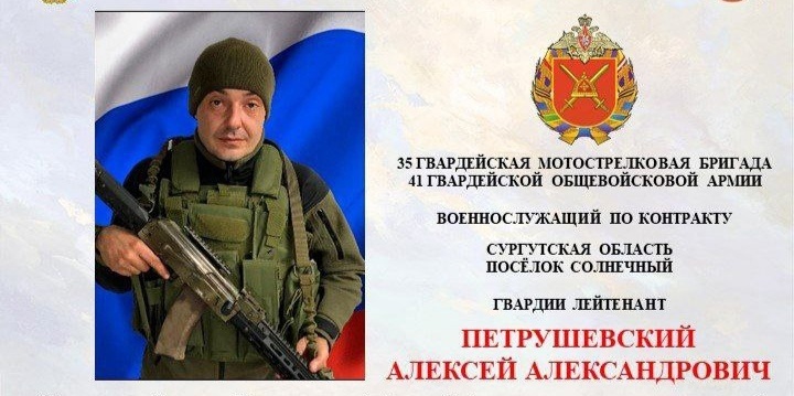 Военнослужащий из поселка Солнечный Сургутского района Алексей Петрушевский находится в зоне специальной военной операции по контракту с сентября 2023 года. Несёт службу в 35-й гвардейской мотострелковой бригаде.Он успешно окончил курсы повышения квалификации в Донецком высшем общевойсковом командном училище с присвоением воинского звания лейтенант и с мая 2024 года принимает участие в СВО в должности заместителя командира роты военно-политической работе.
