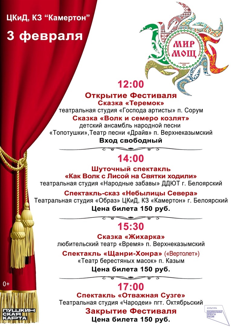 В фестивале примут участие любительские театральные коллективы Белоярского района и пгт. Октябрьский. Открытие состоится 3 февраля в 12:00, билеты можно приобрести в том числе по Пушкинской карте.