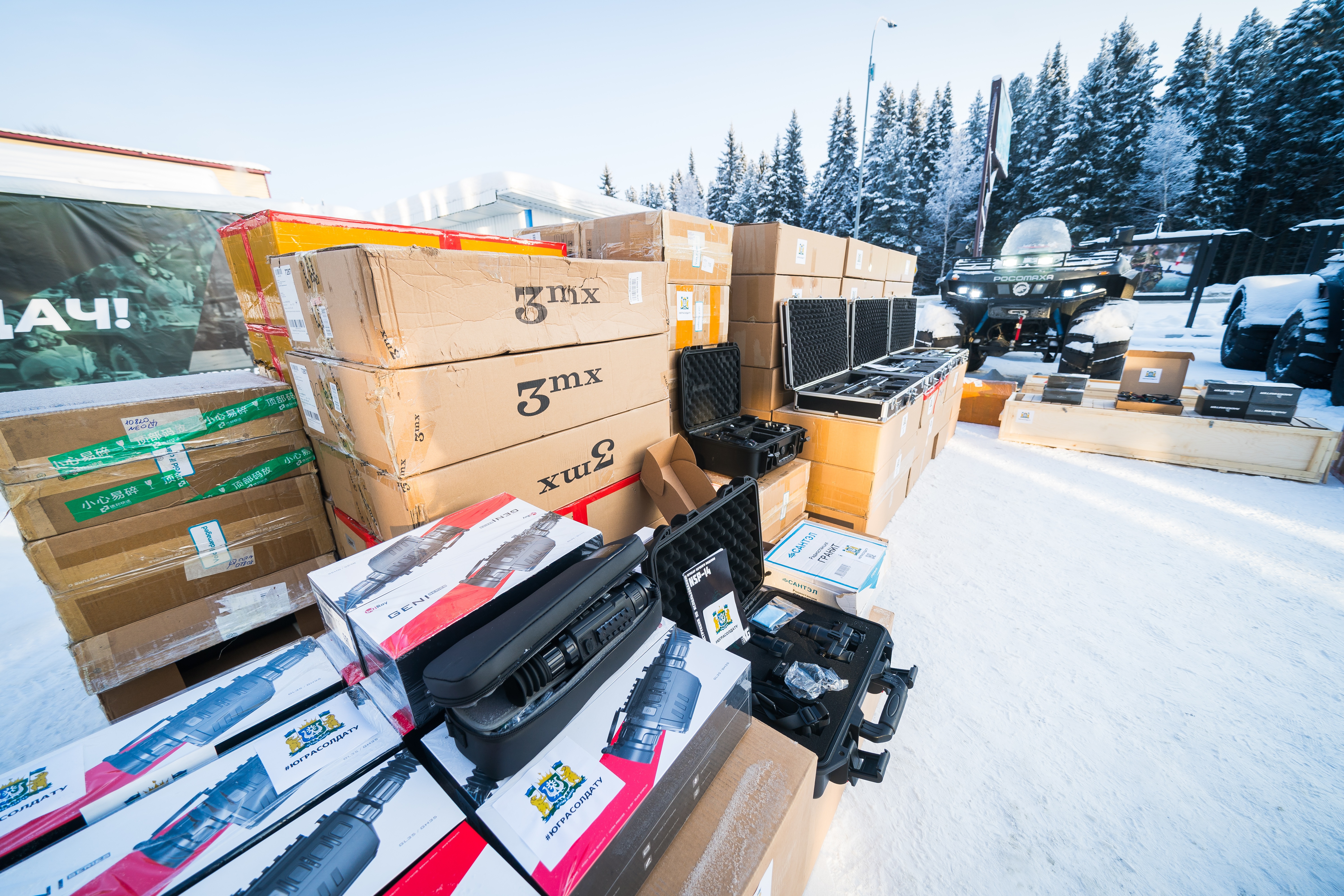 «Мы отправляем в зону специальной военной операции имущество, которое было приобретено по заявкам военных частей, более 100 наименований. Мы отправляем снегоболотоходы «Росомаха», они укомплектованы уже проверенными четырехтактными двигателями. В составе имущества также тепловизионные прицелы, лазерные дальномеры, квадрокоптеры, противодронные ружья», — сказал представитель организатора сбора и отправки груза Антон