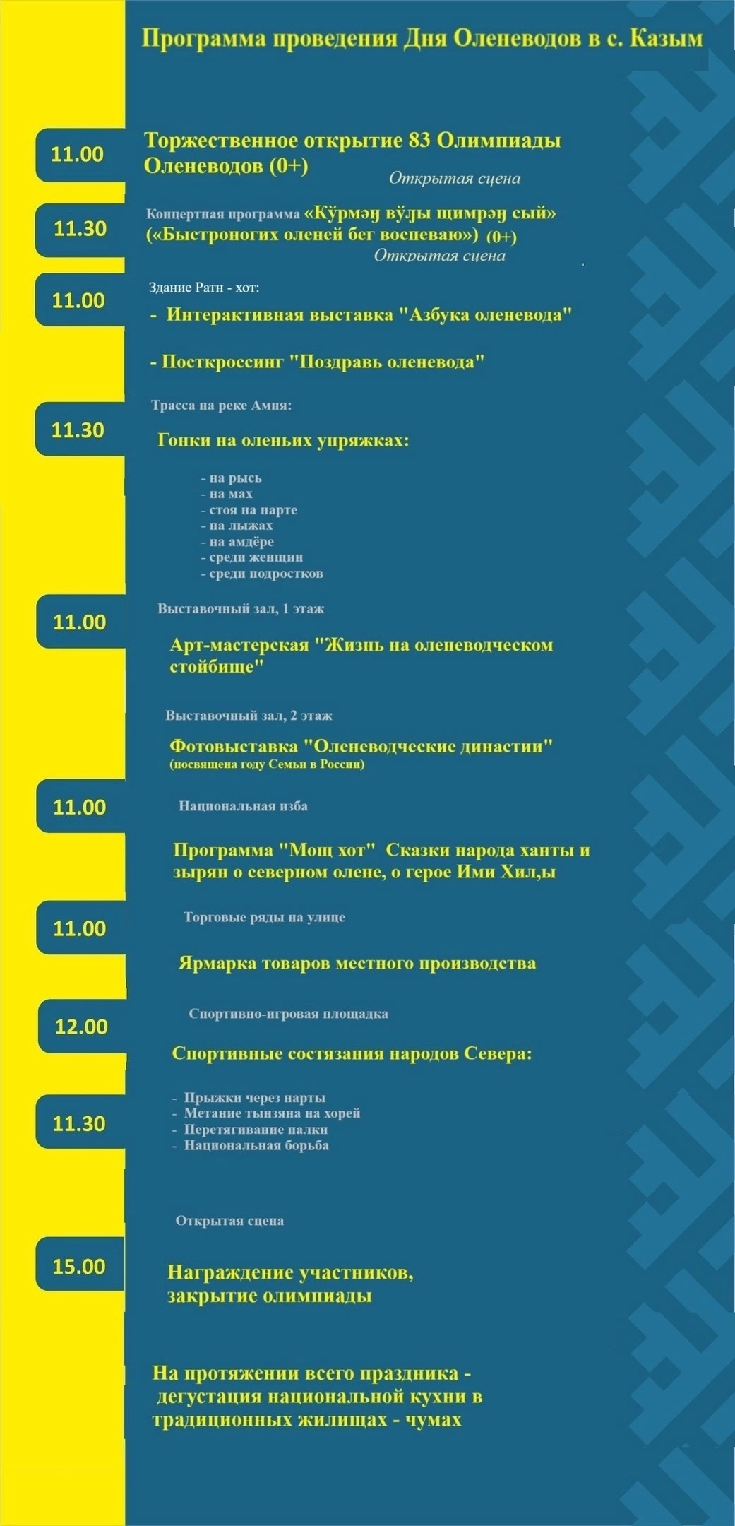 17 февраля праздник состоится в Казыме, 21 – в деревне Нумто. День оленевода в Казыме состоится в рамках 83-й Олимпиады оленеводов. В программе - чествование тружеников отрасли, ярмарка, выставки, мастер-классы, национальная кухня, национальные виды спорта и игры. Участники олимпиады будут состязаться в гонках на оленьих упряжках, национальной борьбе, бросании тынзяна на хорей, прыжках через нарты. Купить билет можно в том числе по Пушкинской карте.