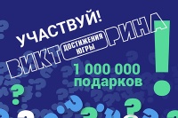 Напомним, Викторина беспроигрышная, в копилке — миллион подарков, а особо удачливые могут получить новые квартиры, новые машины, сертификаты на покупки на маркетплейсе до 30 тысяч рублей, бытовую технику.